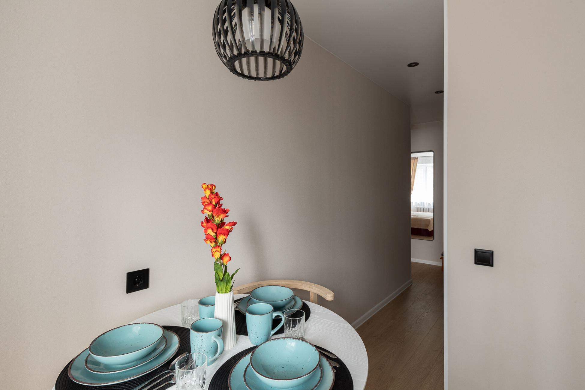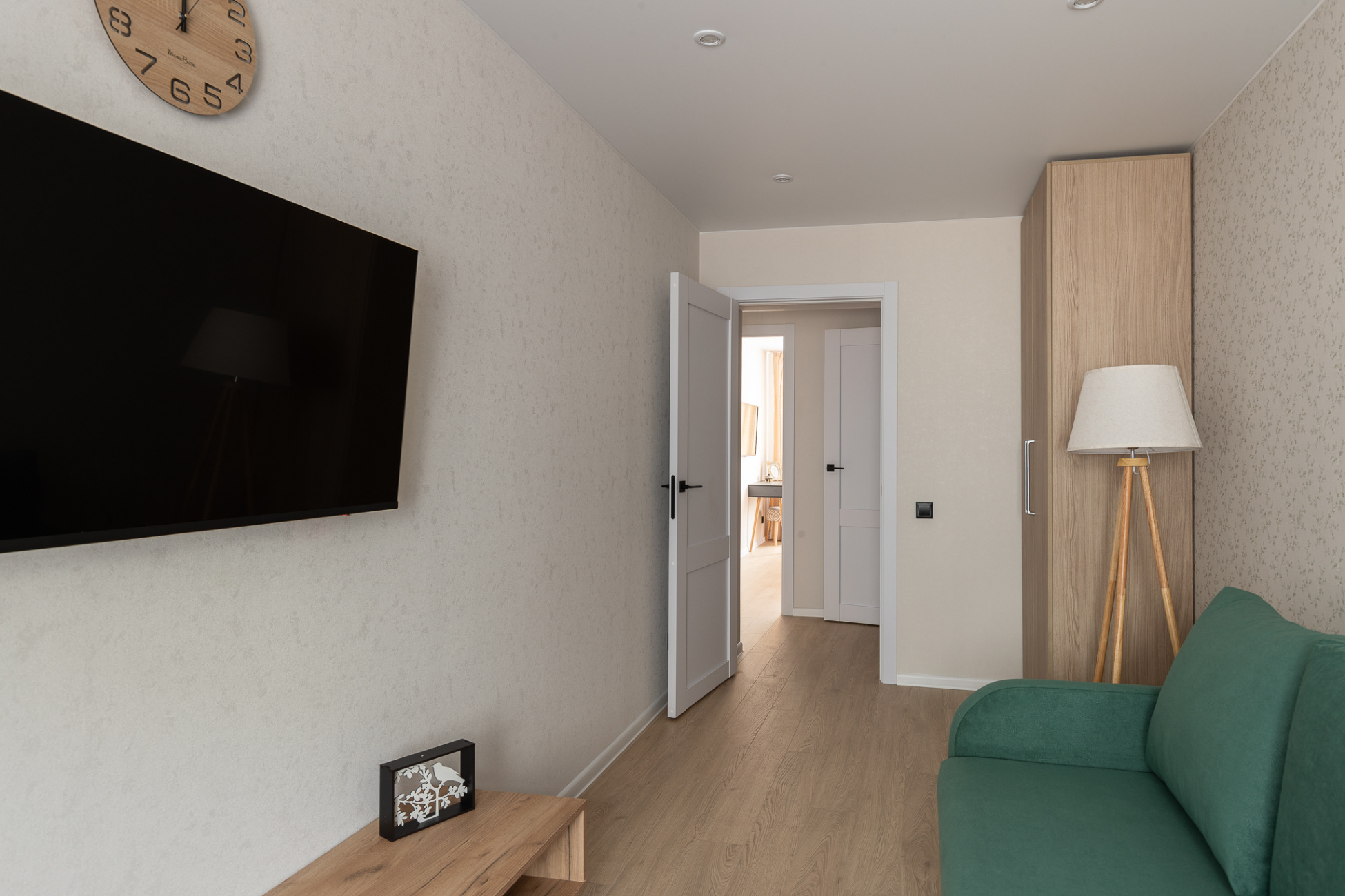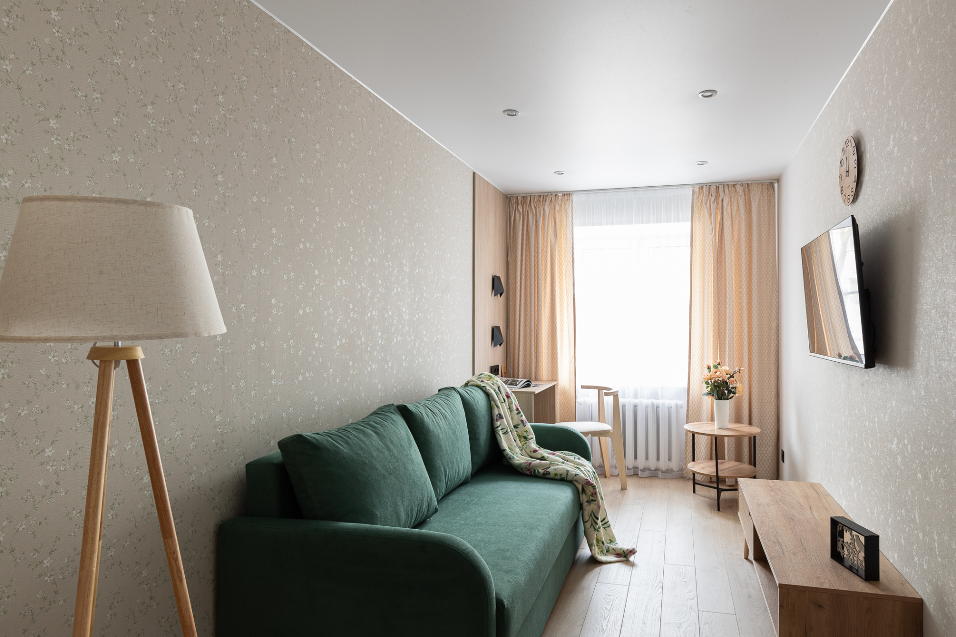Светлые стены с декоративными элементами создают ощущение простора и уюта. Теплая цветовая палитра придает комнате особую атмосферу.