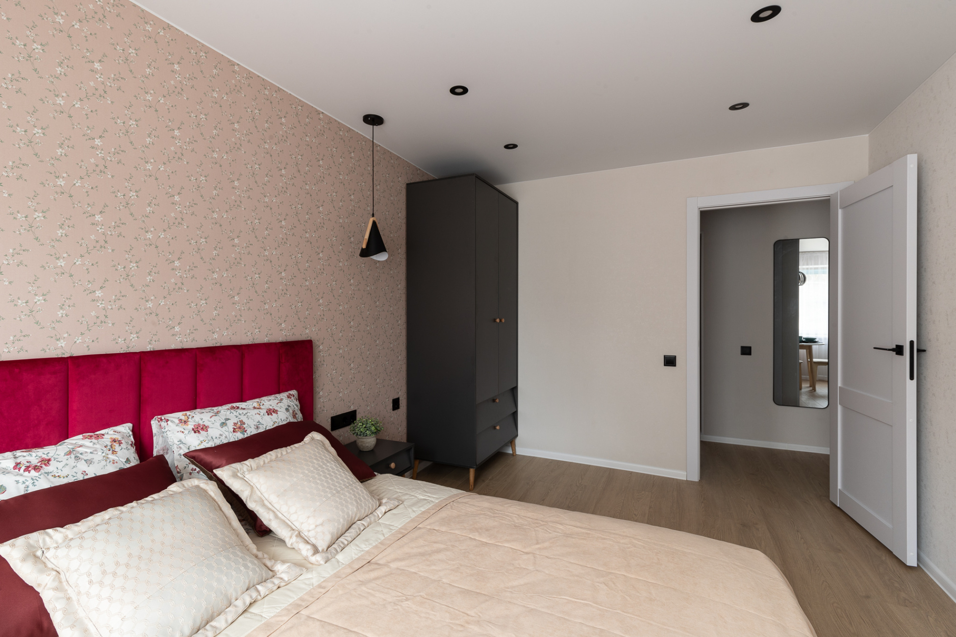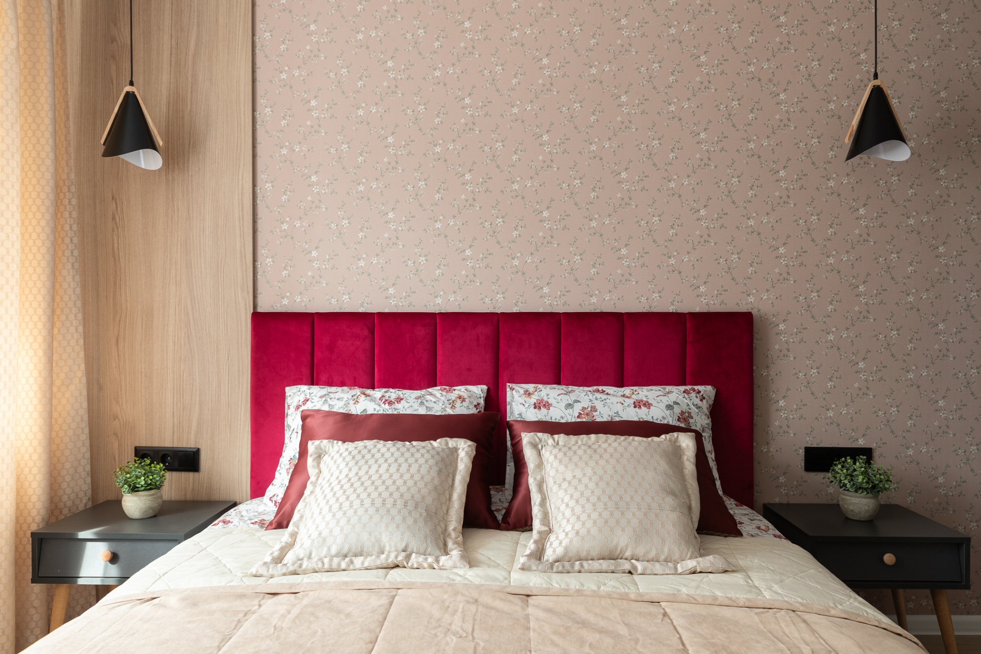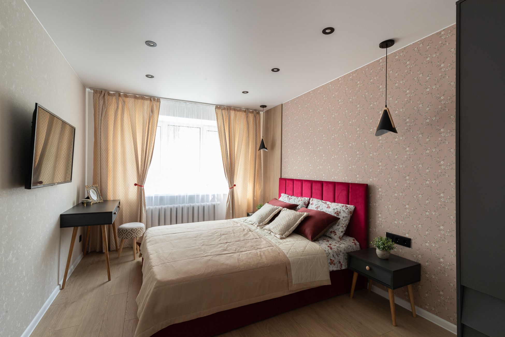 Светлые стены с декоративными элементами создают ощущение простора и уюта. Теплая цветовая палитра придает комнате особую атмосферу.